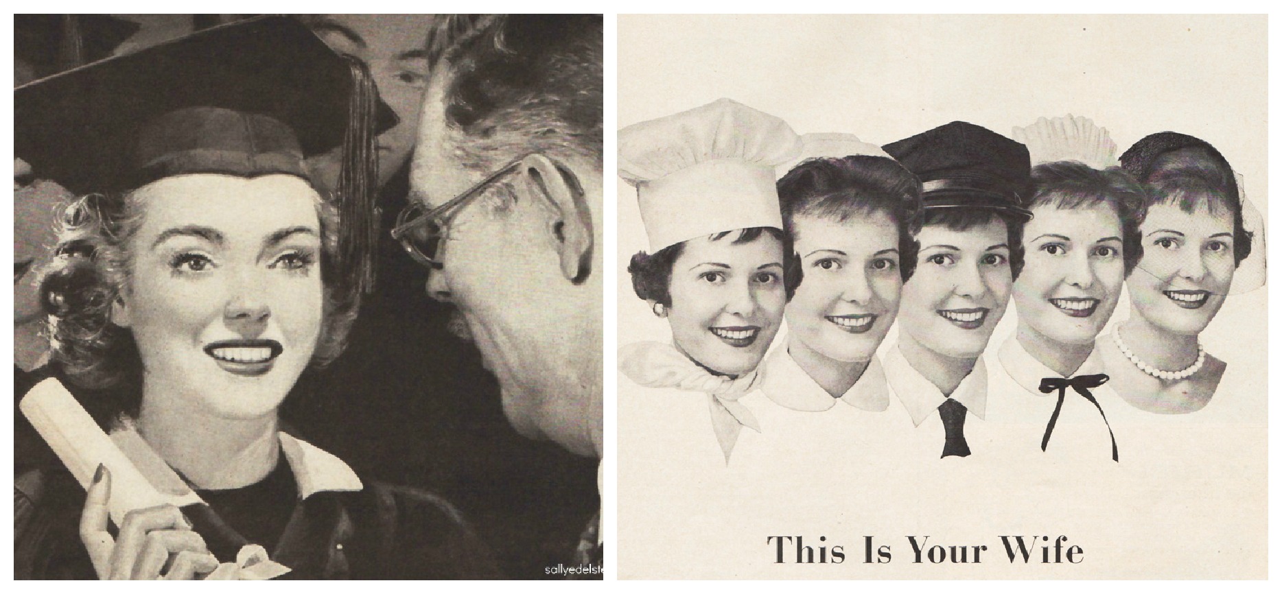 The Bell telephone ad on the right declares “This is the pretty girl you married. She’s the family chef. And the nurse. And the chauffeur and maid.And when she’s all dressed up for an evening out- doesn’t she look wonderful? How does she do it?”