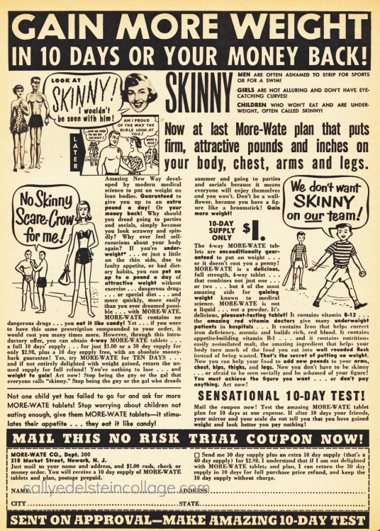 “With the help of new miraculous MORE-WATE tablets, no more skinny scare crow for you!.