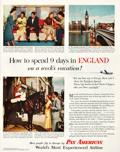 Take this ad for Pan American Airlines from 1953, describing one average Connecticut couples flight to England aboard a double Decker “Strato” Clipper.