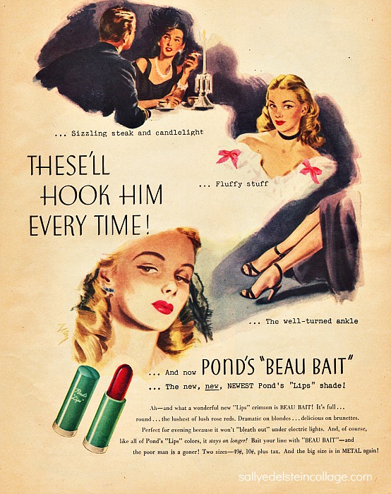 With their new Beau Bait lipstick, in the wartime scarcer than scarce metal case, a gal could “hook him every time”.