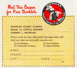 “That’s the kind of fan mail that goes out of Michigan by the carload every year, ” begins the vintage ad, “….cards and letters that sing a happy song of praise for Michigan’s peerless playgrounds…the clear, blue waters of its thousands of lakes…its scenic drives and romantic trails…its spick-and-span resorts and its genial helpful hosts.”