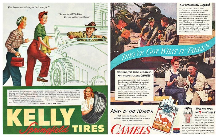 Rosie and her pal patriotically carpool to their job at the defense plant in this Kelly Tire ad from 1945. (R) Camels salutes the efforts of Rosie in building a tank