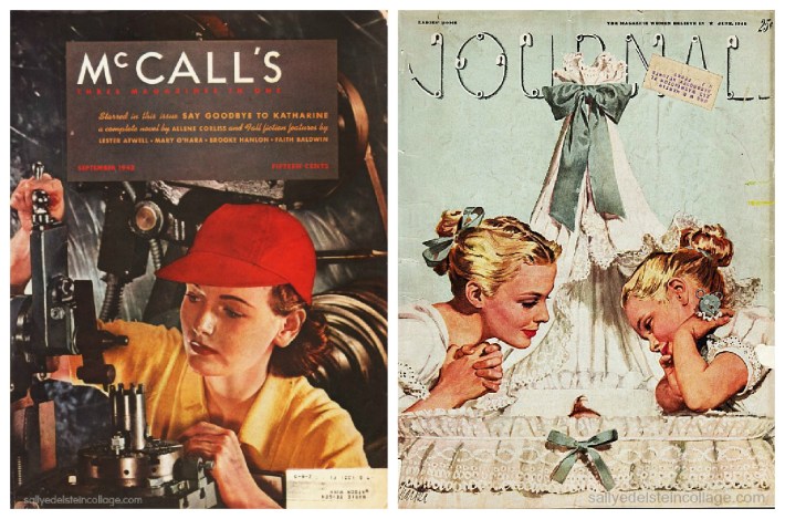 Rosie the Riveter is quickly replaced as a cover girl by Mother and child in the immediate post-war years (L) Vintage McCalls Magazine cover September 1942 (R) Vintage Ladies Home Journal June 1946, illustration by All Parker