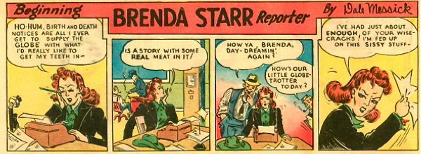 Brenda Starr was a career gal who was a smart, glamorous, and a headstrong star reporter for the Metropolitan Daily The Flash. She traveled the world solving mysteries, unearthing scoops and stealing the heart of almost every man she meets. When she was not globetrotting in search of sensational stories she was behind a desk stubborn, strong-willed, sassy hard-working and competitive.