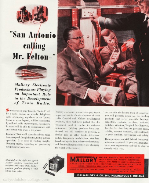 A 1946 ad from P.R.Mallory & Company, a U.S producers of dry cell batteries as well as electrical and electronic components, fairly gushed about the development of the wonder of train radio that would soon be available to the American public.