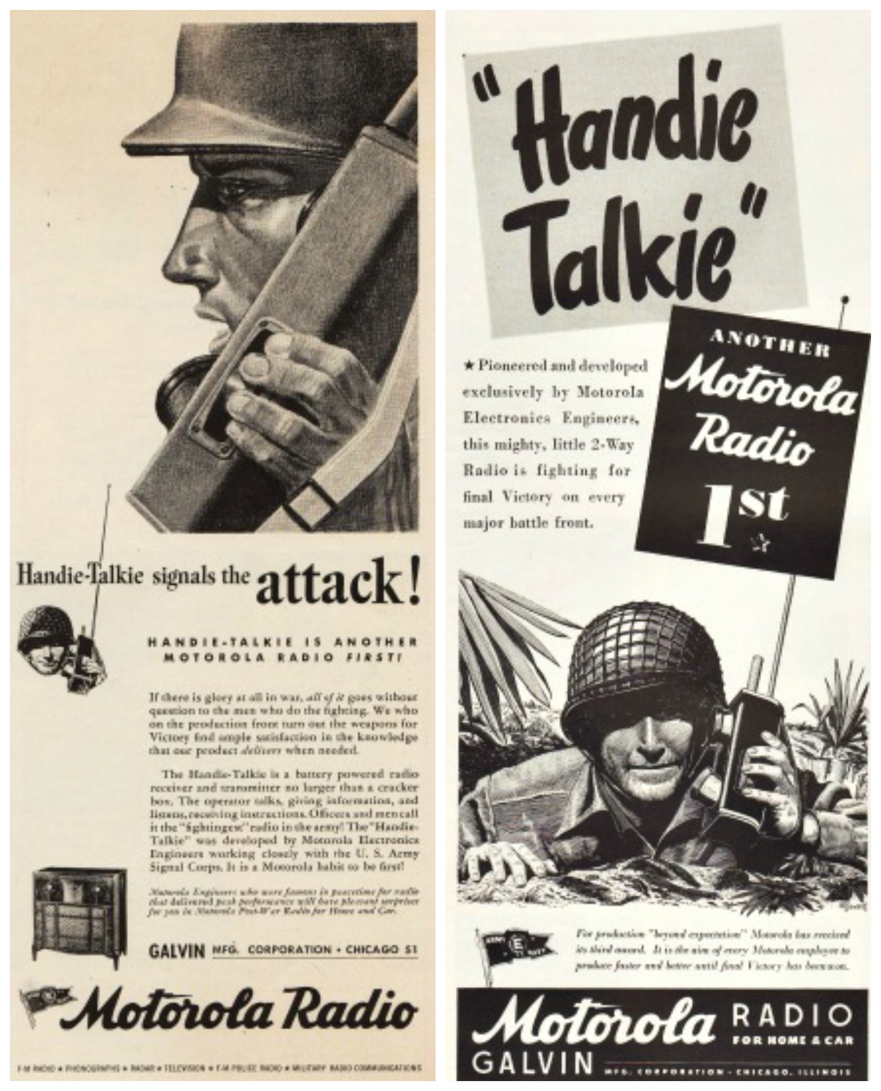 “In a war of vast spaces, swift movement and violent action…radio communication must not fail. Information transmitted with split second speed via the Handie Talkie, the bantam weight portable two-way radiotelephone.”