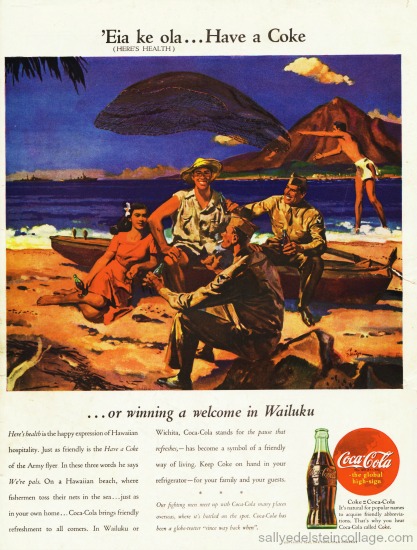 Set in exotic locals such as Hawaii, , Russia, Newfoundland, and New Zealand ,the ads portrayed grinning GI’s mixing it up and laughing over Cokes with British, Polish, Soviet and other Allies always with a caption along the lines “Have a Coke- a way of saying we’re with you.”