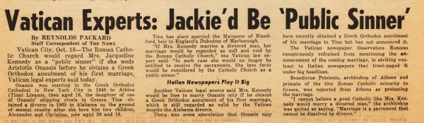 Newspaper article New York Daily News October 19, 1968 Vatican disapproves of Jackie Kennedy’s Marriage to Aristotle Onassis