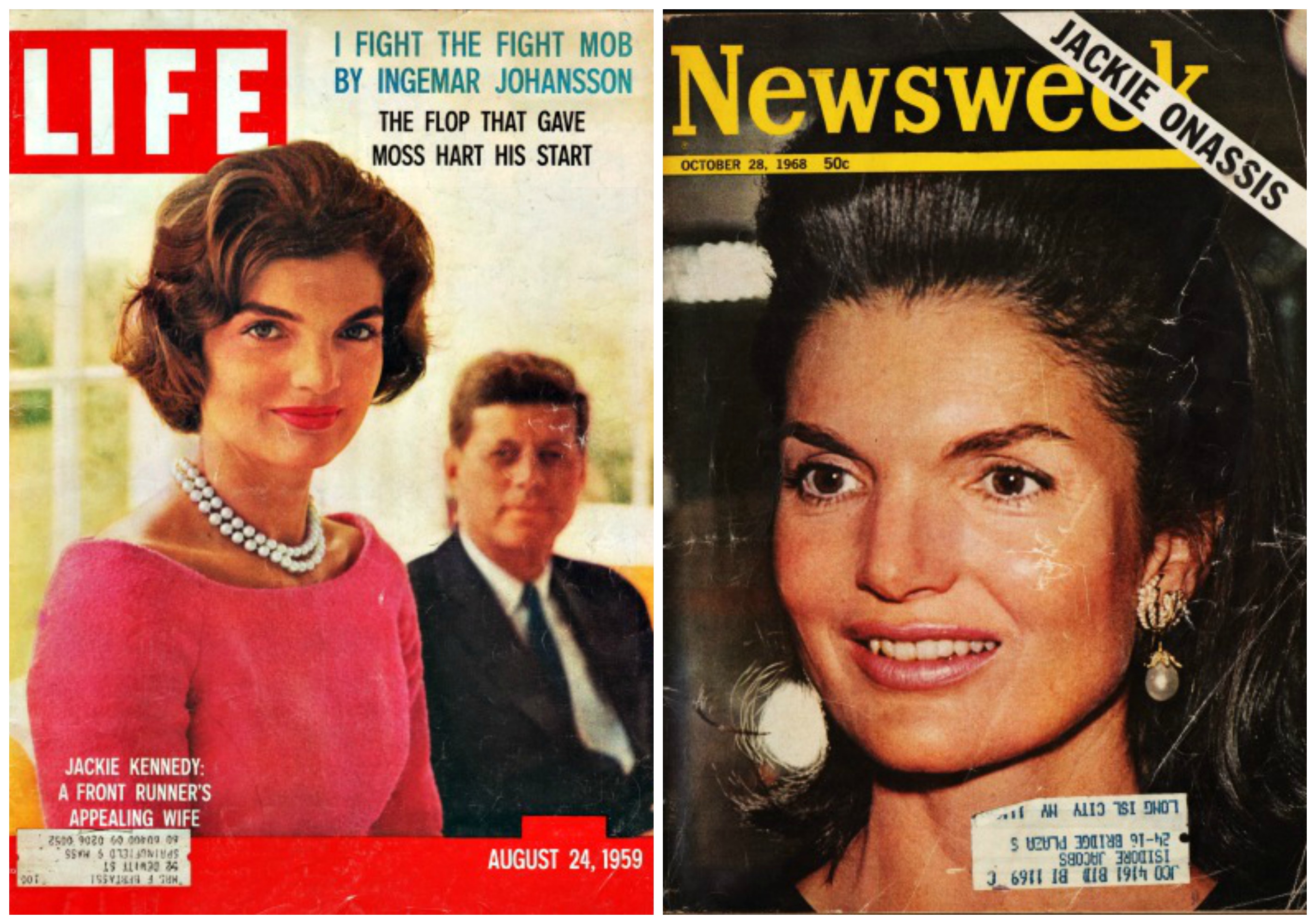 (L) Vintage Life Magazine 8/24/59 Jackie Kennedy as a candidate’s wife (R) Newsweek 10/28/68 Jackie Onassis- The Wedding