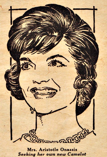 To the shock and dismay of most of Jackie’s admirers, Patty included, the Queen of Camelot had abandoned her reign and, many felt, her reputation, by choosing as her consort Greek shipping mogul Aristotle Onassis, a short (an inch shorter than Jackie, gasp! at 5 feet 5 inches! )swarthy man of 62 who wears dark glasses night and day smokes cigars and has a boatload of money.