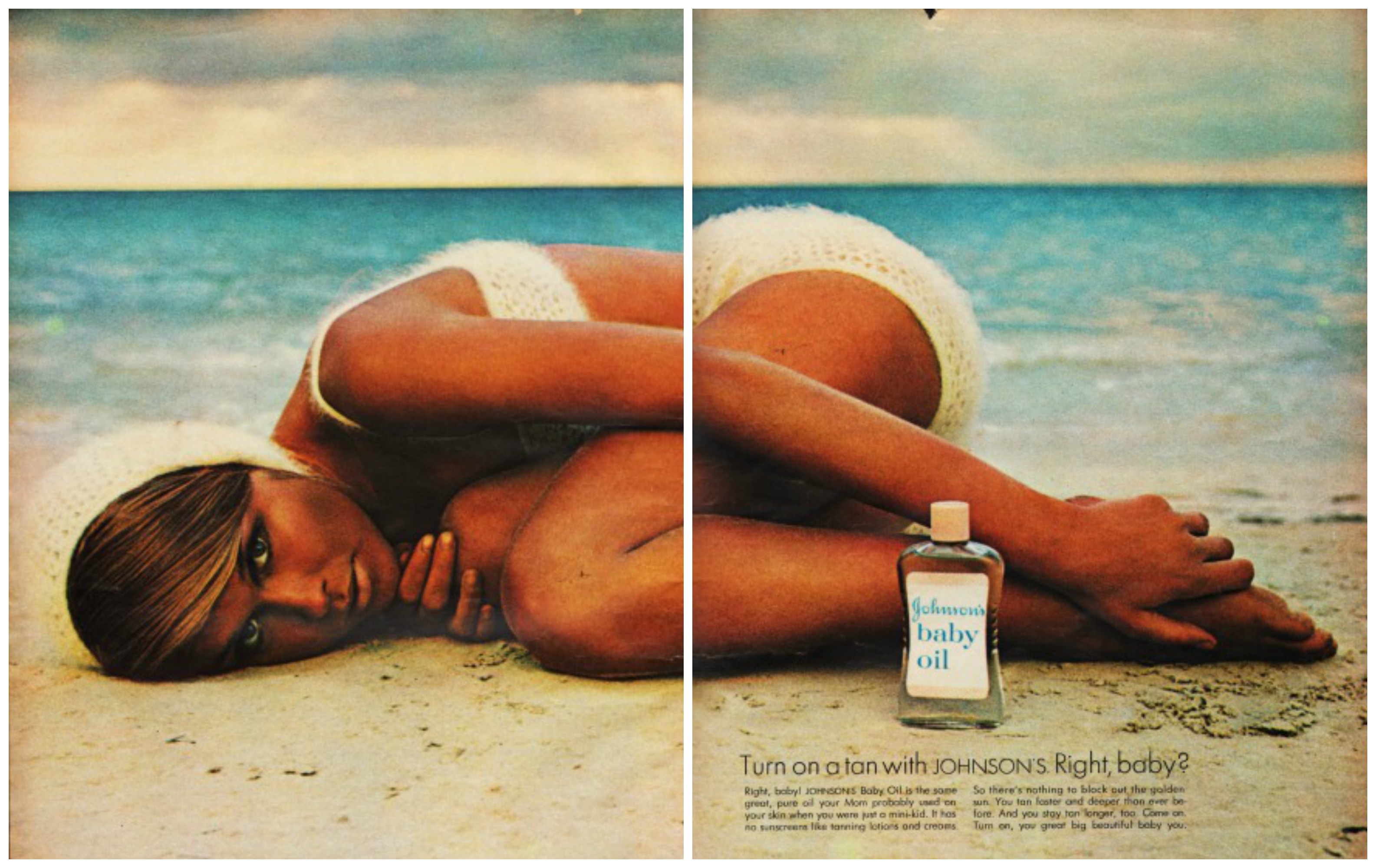 Turn on a tan with Johnson’s Baby Oil – This vintage ad from the 1960s boasts: “It has no sunscreen like tanning lotions and creams. So there’s nothing to block out the golden sun. You tn faster and deeper than ever before. And you stay tan longer. Come on. Turn on you great big beautiful baby you!”