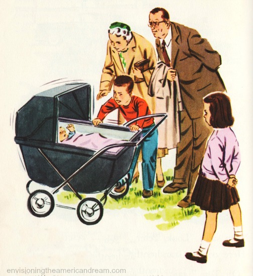 The New Baby. Vintage Children’s Schoolbook illustration from “At Home: Living & Learning in First Grade” 1963 by Paul R Hanna, illustration by Beatrice Derwinski