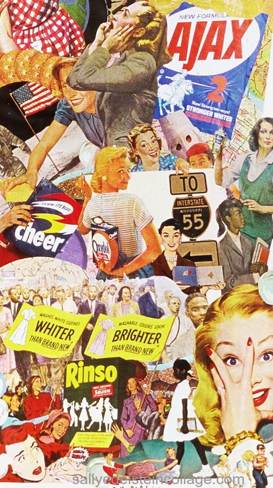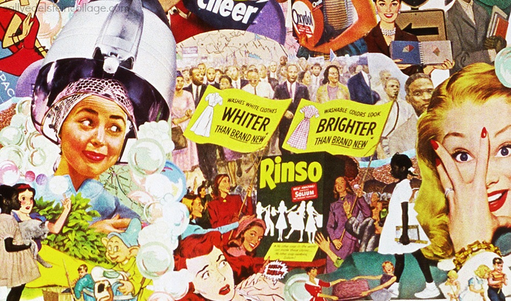 While others were out marching for civil rights in the 1960s fighting to break the color barriers, hermetically sealed housewives in the media were portrayed cheerfully living in a colorfast world obsessed with getting their laundry not just white but whiter than white, a white to unequal others.