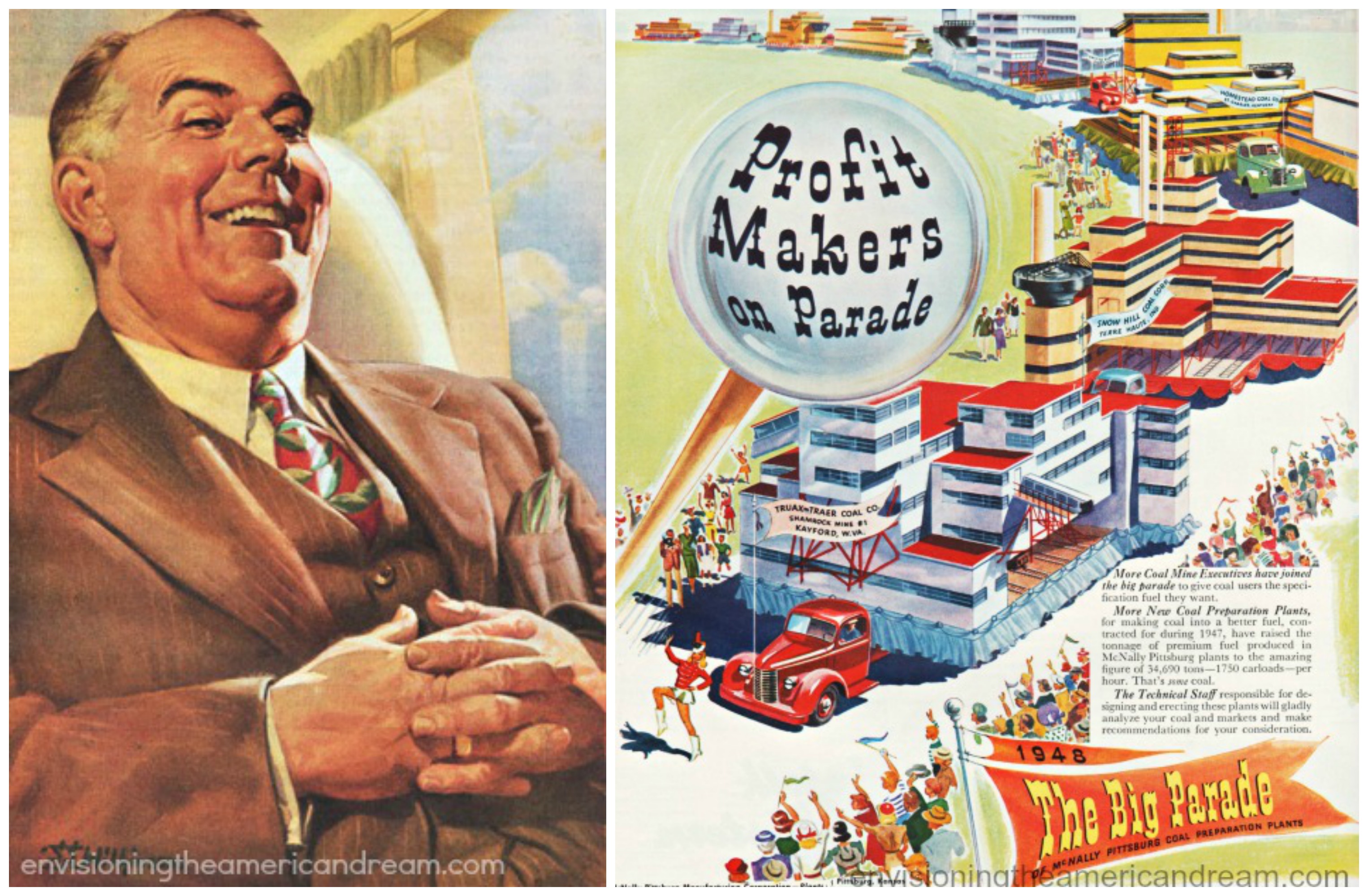 Mid Century Businessmen were sitting pretty (L) Illustration from Martin Aircraft 1946 (R) Profit makers on Parade Coal Industry Ad 1948