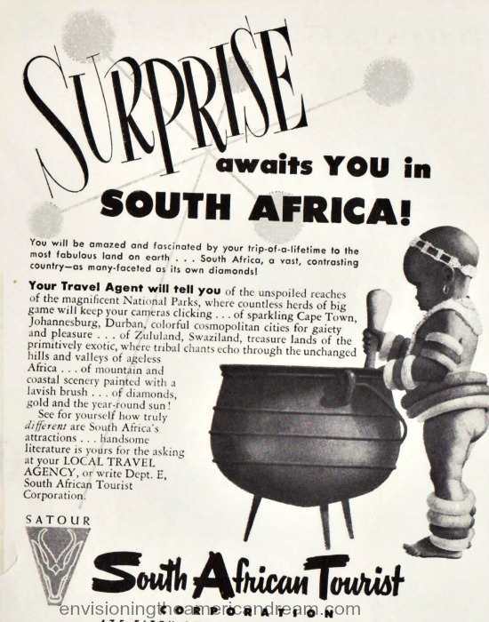 It is hard to imagine, but in that brutal time period of 1950s apartheid, as the dark reality of repressive laws against Black South Africans increased, the sunny South African government actively sought tourism trade as if they had not a care in the world. With the full support of their pals the Americans, they marketed their travel ads directly to adventure seeking Yankees.