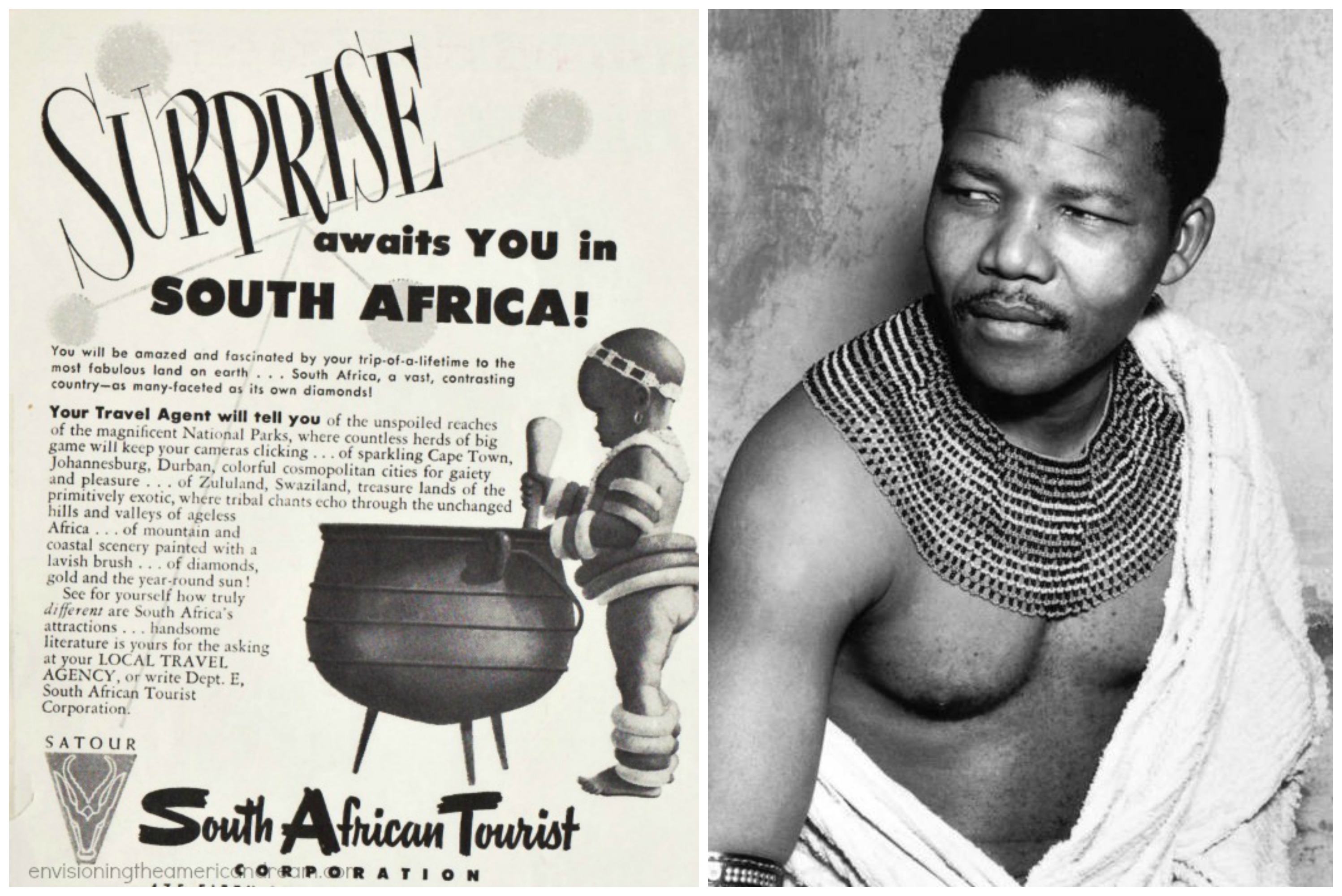 Hoping to attract tourists the South African Tourist Corporation ran a series of ads like the 1953 ad on the left. (R) Nelson Mandela 1950s