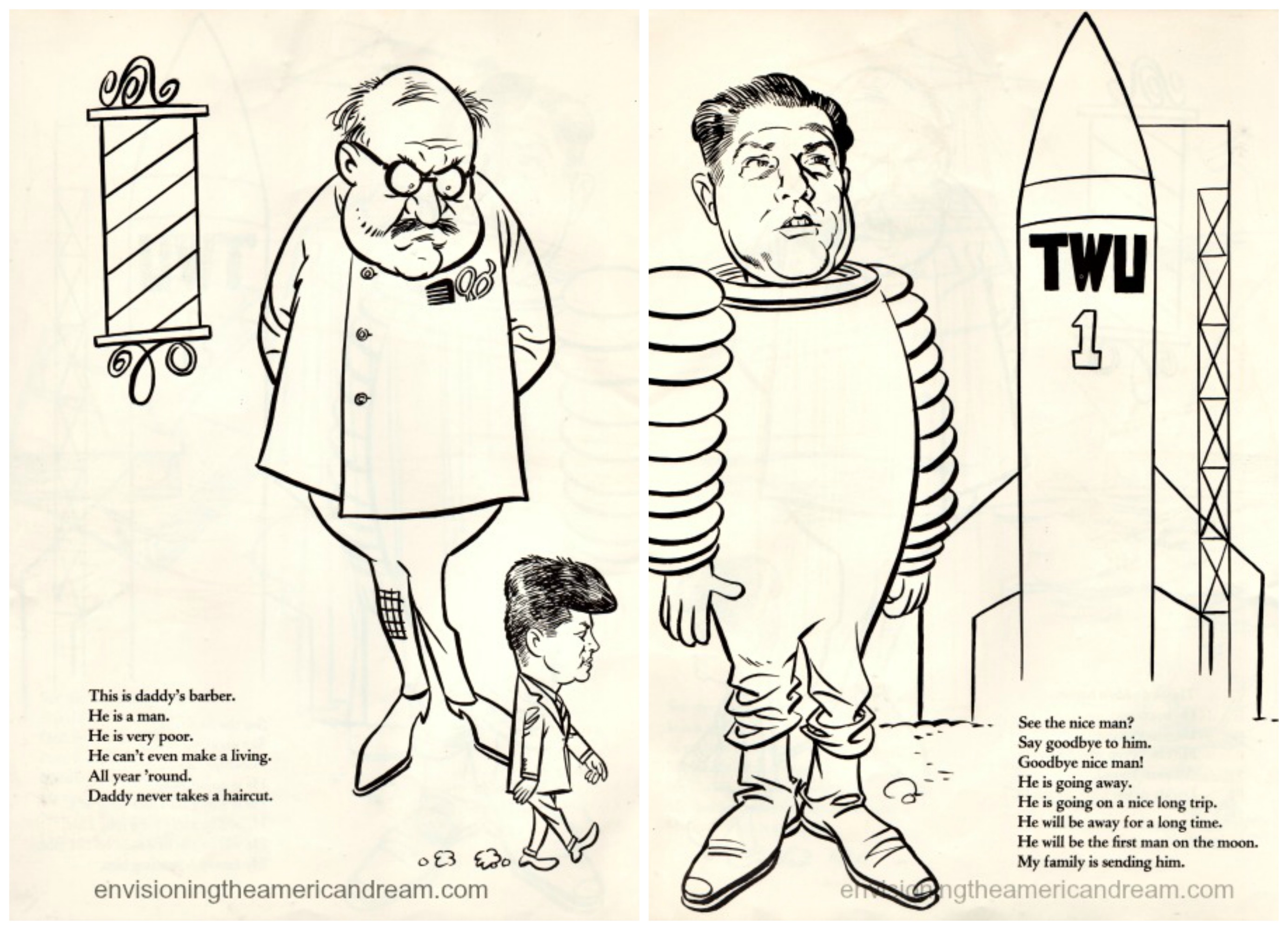 The president shock of unruly hair was a constant source of jokes for comedians and commentators alike. The figure on the right is Labor Leader Jimmy Hoffa whose connections with organized crime caused attorney General Robert Kennedy to pursue him ruthlessly,carrying on a so called “Get Hoffa” squad of prosecutors and investigators. Sending Hoffa to the moon would apparently solve their problem.