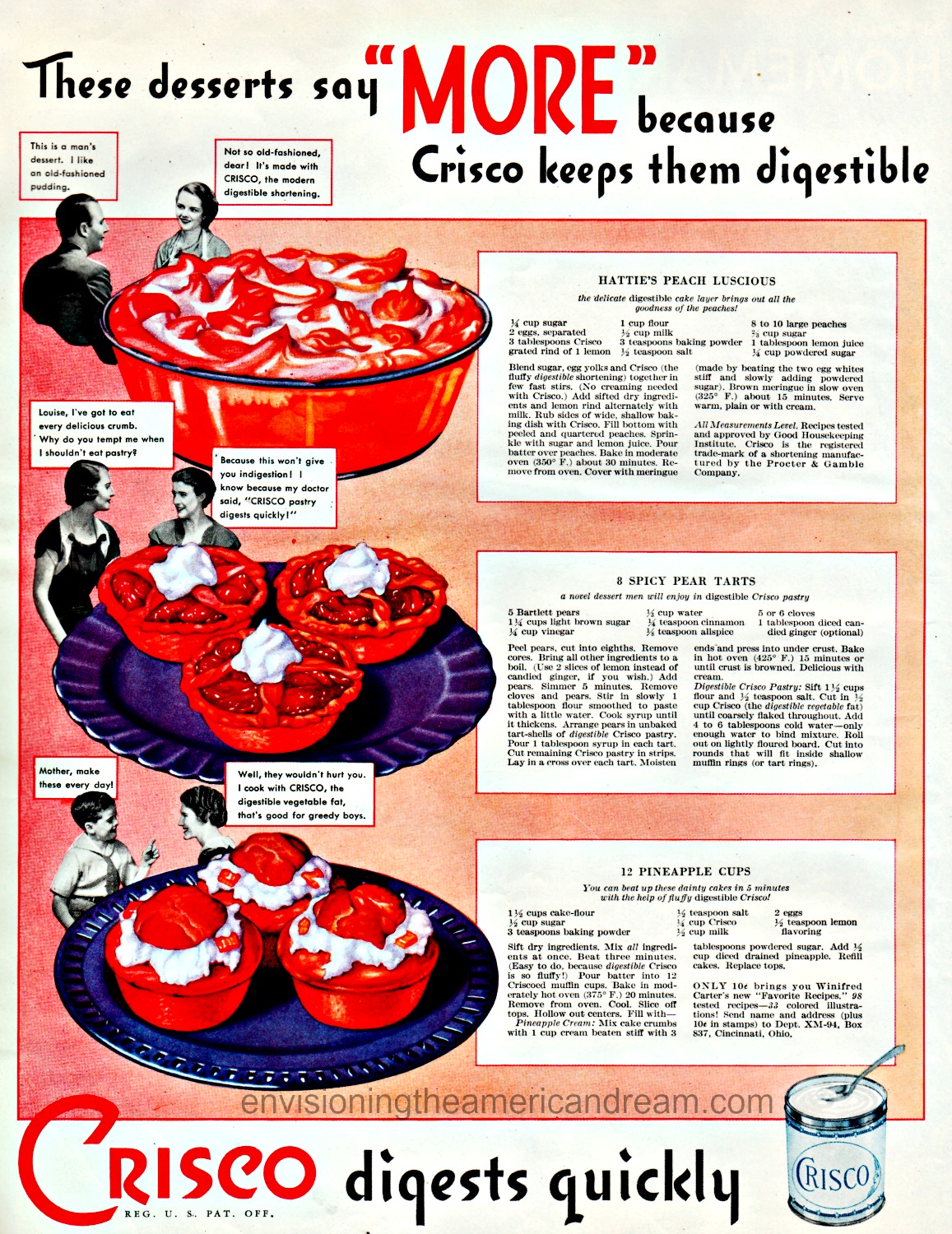 “Why long for pie but fear to eat it? Why condemn fried foods as indigestible?” asks this Crisco ad from 1937. “Doctors know that Crisco gives easy digesting food for junior to Grandpa. Here’s the case where food that’s good for you tastes extra good.”