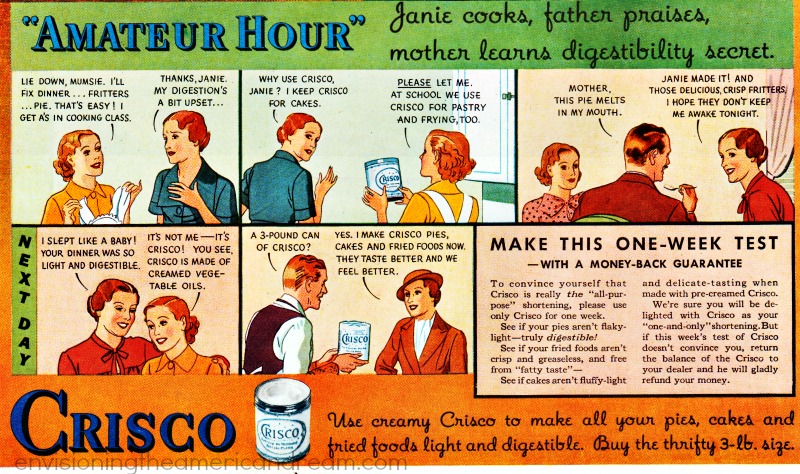 Before you french fry another potato or make another pie let me tell you some thing about Crisco that’s terribly important,” begins one ad. “Crisco digests quicker. Crisco doesn’t overtax the stomach!”