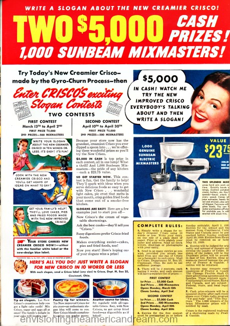 In this 1939 Contest you were asked to write a slogan for creamier Crisco using 10 words or less for the chance to win $5,000 Cash or 500 second prizes of Sunbeam Mixmasters.