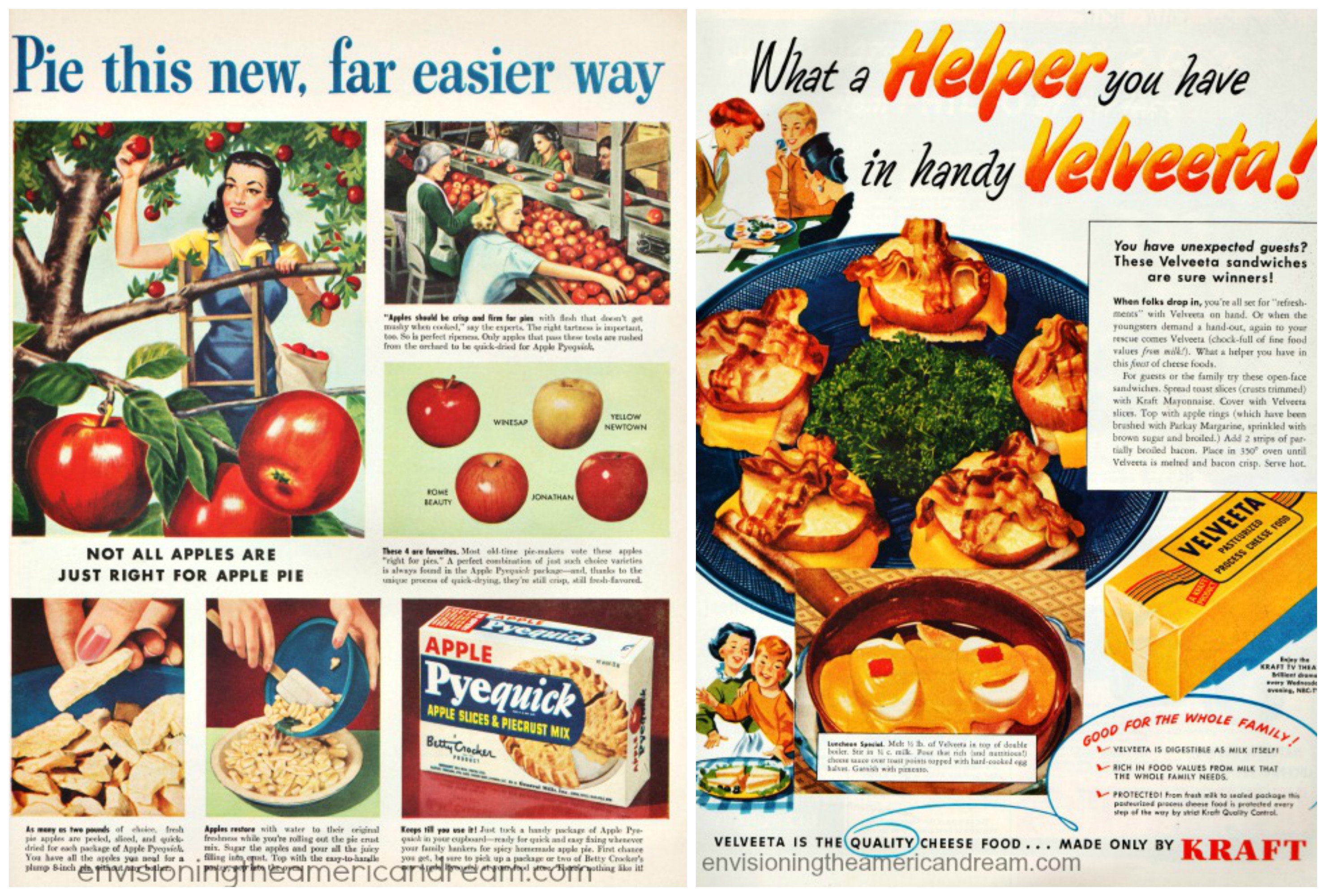 (L) 1948 Vintage ad for Pyequick Pie Mix from Betty Crocker a far easier way to make an apple pie from a freeze dried apples and pie crust mix. (R) Vintage ad Velveeta processed cheese food