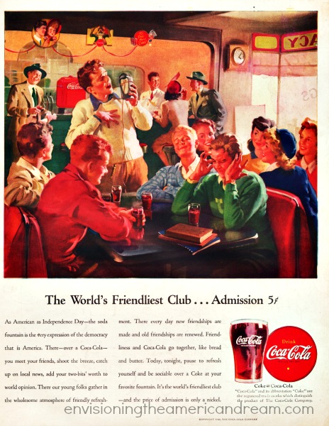 “The soda fountain” that  dispensed Coca Cola  was, they explained in a 1946 ad,  “as American as Independence Day …the  very expression of Democracy!”
