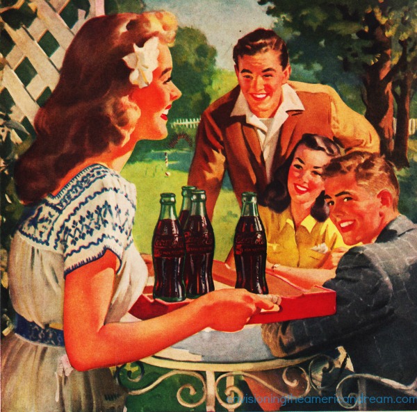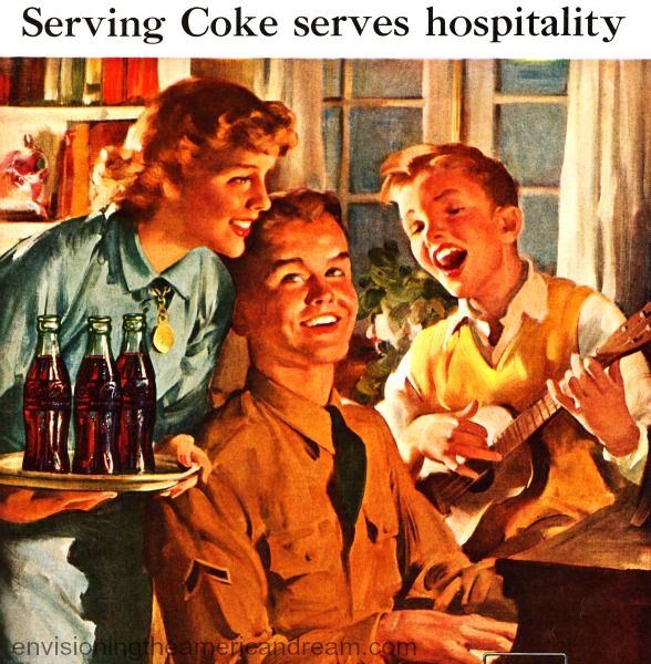 “There’s always a welcome – at your favorite soda fountain.This congenial club is as warm and American as an old-fashioned barbecue or band concert right in the village square.” vintage Coca Cola ad 1946
