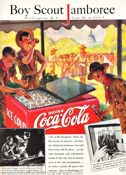 “On to Washington, shouts the Boy Scouts of America for their first national Jamboree. A group of good fellowship for all boys. Naturally ice cold Coca Cola will be there”