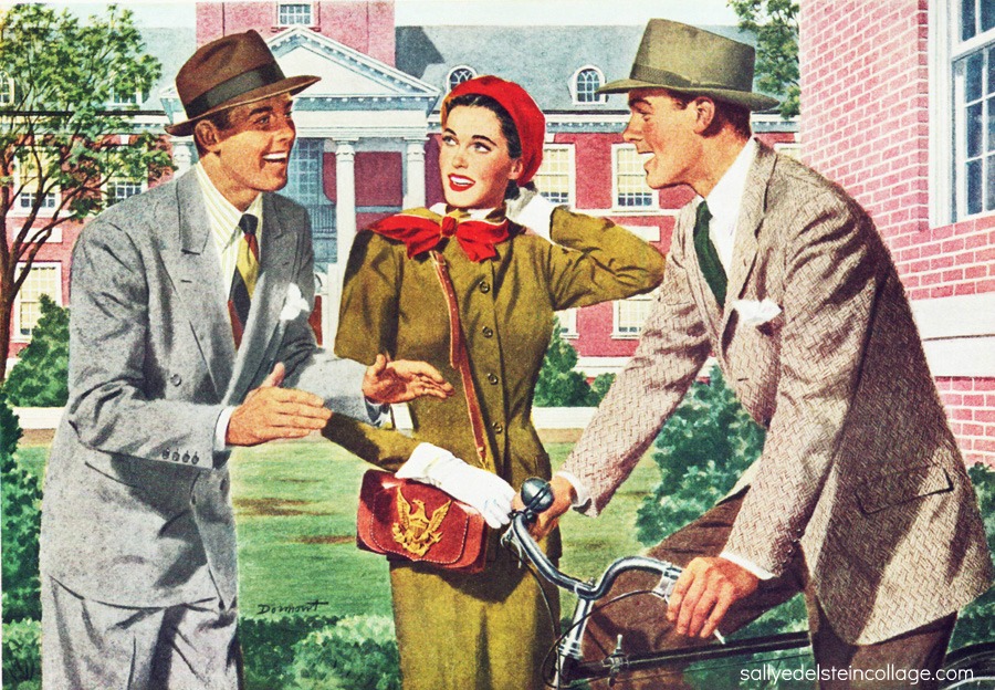 “It happens to every girl- that mellow moonlight and roses feeling when the man of the moment begins to look like the biggest thing in her life. If you’re a wide awake bright-eyed kind of gal who gets a kick out good books, good football games and good brisk walks in the rain, it’s inevitable,” began a column directed to sub debs in a 1946 issue of Ladies Home Journal.