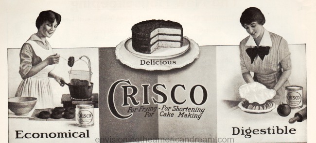 It may be hard to digest but there was a time when vegetable shortening made from hydrogenated oil like Crisco was a smart, wholesome choice. Labor saving and economical this cooking fat was a wonder for the harried, health conscious housewife.