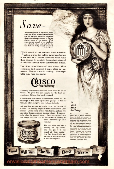 Now that we were at war patriotic housewives were asked to conserve food. We were admonished to save wheat, use less sugar, and use no butter. Use of Crisco would contribute to the war effort.