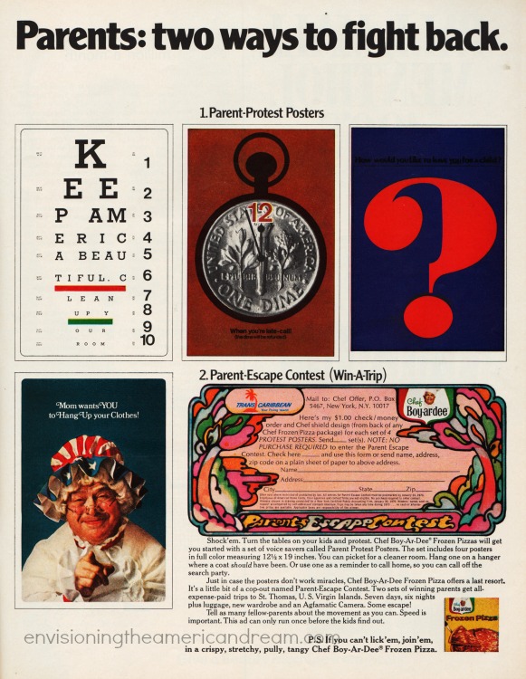 Capitalizing on the generational gap, Chef Boy-Ar-Dee chimed in with this 1969 ad aimed at parents struggling with protesting, rebellious kids.