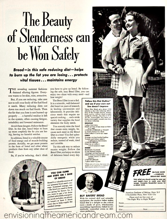 Authorized by the American Institute of Baking, their ads promised “To gain alluring slimness don’t think you have to starve yourself. Take the safe way to slenderness. Go on the Bread Diet.”