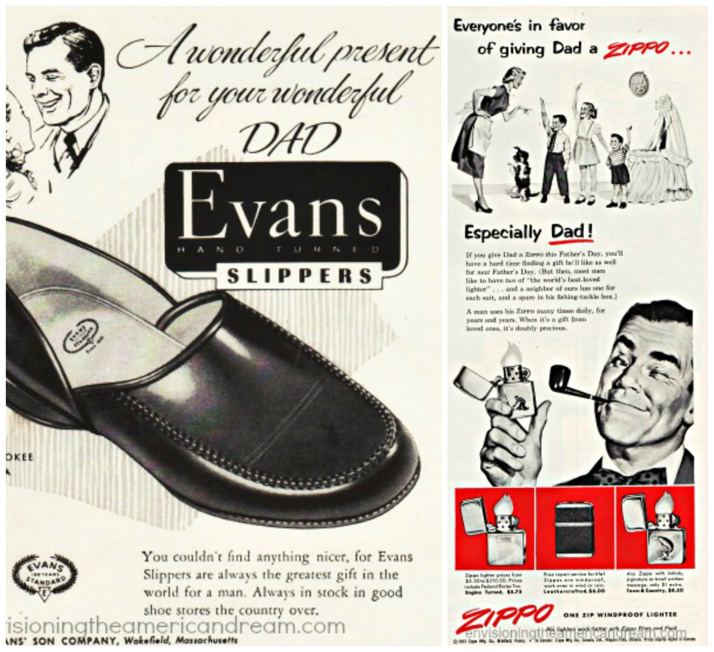 A Pipe and Slippers Fit for a King (L) Vintage Fathers Day ad Evans Slippers 1951 (R) Vintage ad Zippo Lighters For Fathers Day