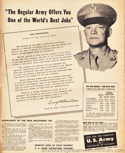 Efforts were made to get the Vet to re-enlist including pleas from their former Commander General Eisenhower in this 1946 recruitment ad. “How about it Vet? Want to get set for life? Hustle down to the Army and Air Force Recruiting office and see about the special deal that’s waiting for veterans.”