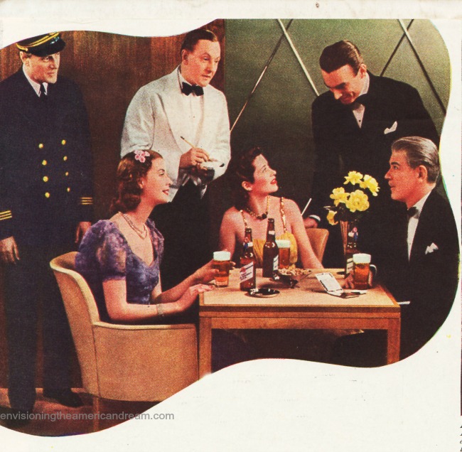 “On the Normandie Pabst gets the call. Luxury flagship for the French lie the worlds most sumptuous “hotel-a float.” Where genius in décor and cuisine meet genius in brewing- Pabst Blue Ribbon world favorite of world travelers.” Vintage ad Pabst Blue Ribbon 1939