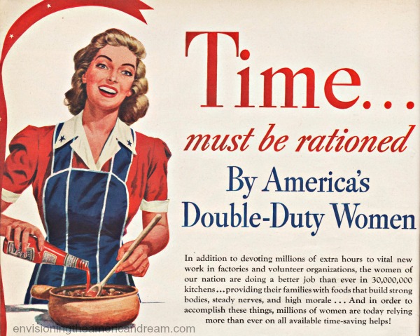 These ads encouraged women to stick to their jobs despite the demands of a 2 job life style. Vintage ad Heinz 1942