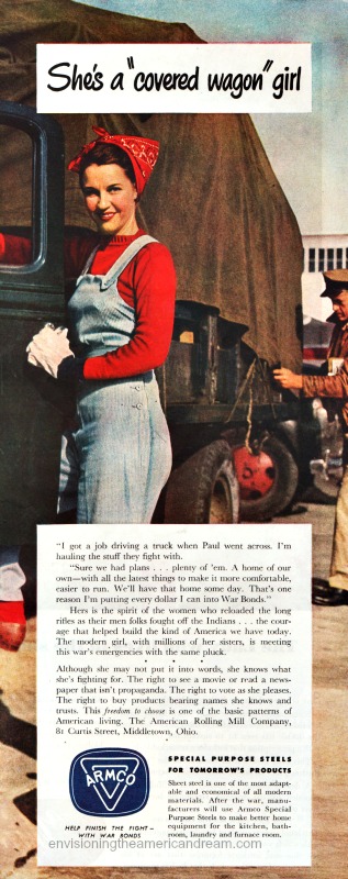 This modern girl with millions of her sisters is meeting this wars emergencies with the same pluck as the pioneer gals. “Although she may not put it into words she knows what she’s fighting for. The right to see a movie or read a newspaper that isn’t propaganda. The right to vote as she pleases. The freedom to choose. Vintage ad ARMCO 1944