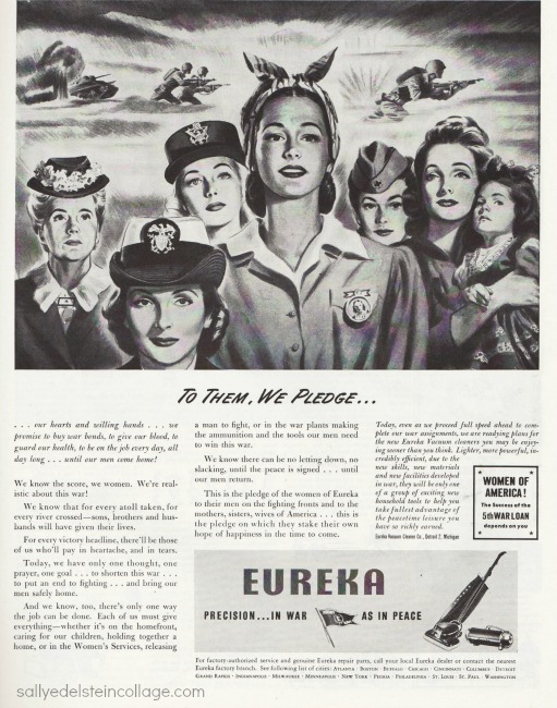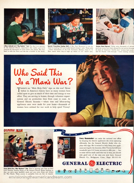In the 1942 ad above, General Electric proudly exclaims: “There is no ‘Male Help Only ‘ sign in this war! Never before in American history have so many women been called upon to give so much of their time and energy to war effort.”