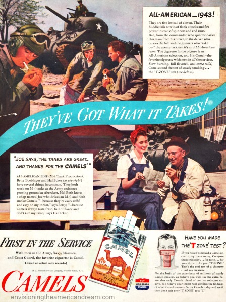 Vintage WWII ad Camels Cigarettes 1943 ” Betty Boeing and Hal Ecker have several things in common. The both work on M-4 tanks at the Army Ordinance proving ground in Md. Both know a chap named Joe who drives an M-4 and both smoke Camels”