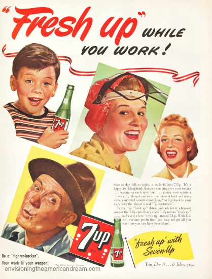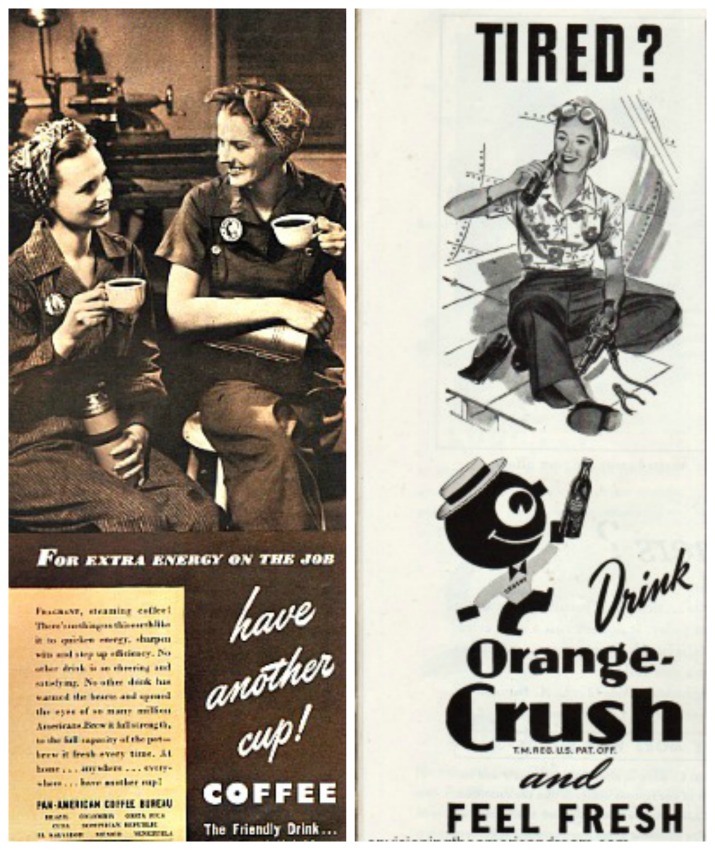Whether working the swing swift or regular shift, war work requires extra energy. Get a lift from coffee or sugary drink. (L) Vintage ad 1944 Coffee Institute (R) Vintage WWII ad Orange Crush Soda 1943