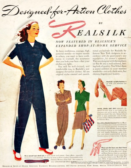 Real Silk, a shop at home service made famous for their luxurious pre war silk stockings switched gears and offered work clothes designed for action…just not the sexual kind!. These were clothes designed to inspire morale in others.”
