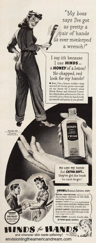 For hands he loves to touch. “Sure I’m a factory worker- jeep suit and all. But with Hinds my hands are as pretty as you please.” Vintage ad Hinds Hand Cream 1942