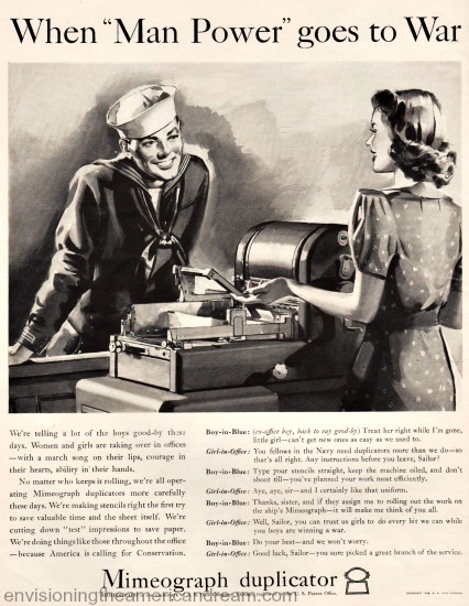 Before our sailor ships off he offers some advise about the mimeograph machine : “Treat her right little girl- can’t get new ones as easy as we used to.” Vintage ad Mimeograph Duplicators 1942