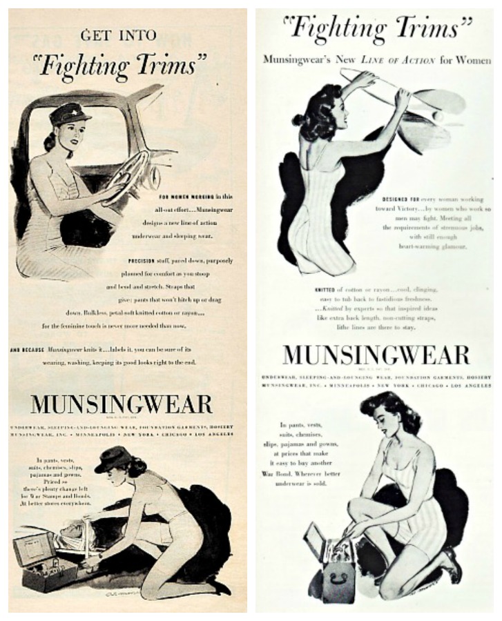 “There’s a new woman today,” Munsingwear Underwear proudly announced in a series of ads, doing a mans job so that he may fight and help finish the war sooner. With that in mind they created a new Line of Action undies called “Fighting Trims”just for working women