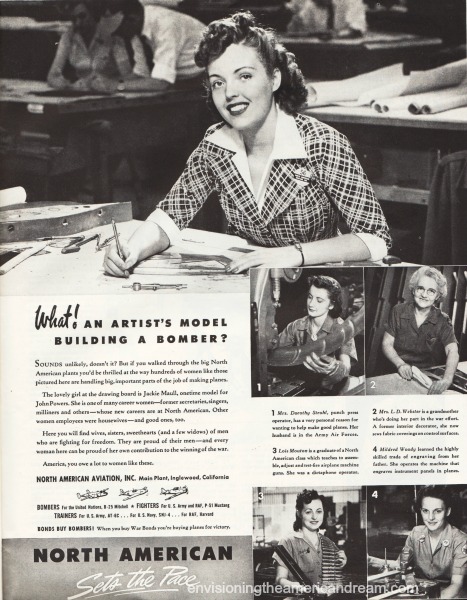 In a 1943 ad, North America Aviation introduced us to lovely Jackie Maul a former model whose job reading blueprints clearly didn’t destroy her sex appeal or womanliness. The reader is reassured: “She still loves flowers hats veils, smooth orchestras and being kissed by a boy who’s now in North Africa.”