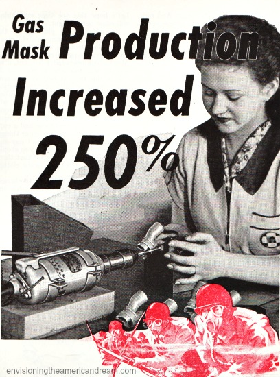 Some advertisements were designed specifically to attract women to war work. Many companies that advertised no longer produced consumer goods due to war production demands so ads also served as a way to keep their name in public eye.