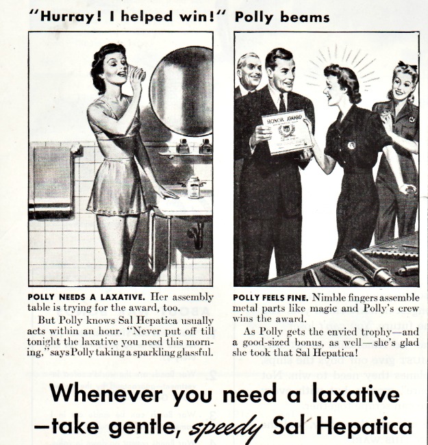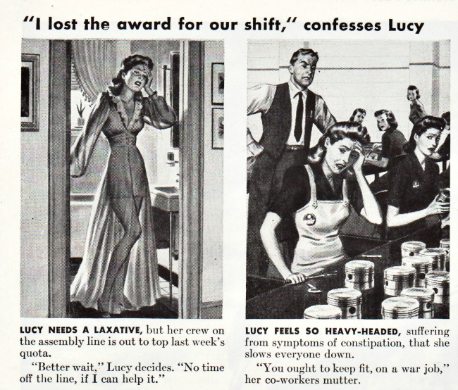In one 1943 ad we are introduced to 2 assembly line workers – Out of Luck Lucy whose constipation woes caused our sluggish missy to miss out on a raise, and smart Polly who takes a laxative and takes home a trophy and a juicy bonus.