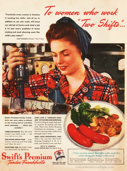 “Practically every woman in America is working 2 shifts,” explains the 1943 ad for Swifts. “Lots of us in addition to our war work still have our old job at home and what a job that is! ‘Last years problems in homemaking and meal planning seem like child’s play,’ says Mary Hoffman Miss Victory. Swifts franfurts come to her rescue save many a minute in trying job of wartime meal planning”