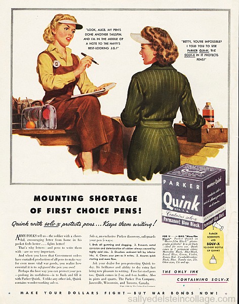 Rosie writes her beau in the service on her lunch break at the defense plant Vintage WWII ad Quink Ink 1943